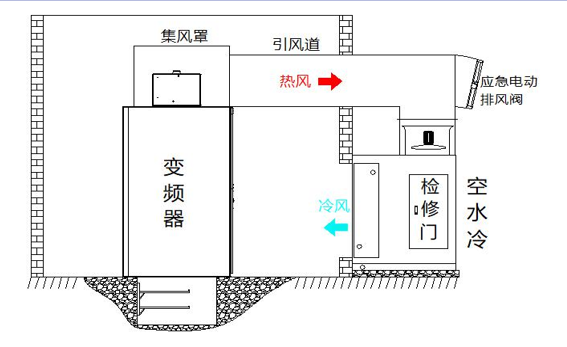 變頻器柜頂制作安裝集風(fēng)罩,收集柜頂風(fēng)機(jī)排 出熱風(fēng),通過(guò)引風(fēng)道將熱風(fēng)引至安裝在室外空水冷 設(shè)備,冷卻后回至變頻室內(nèi)。